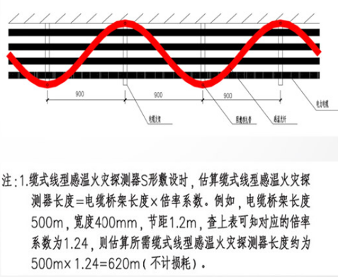 线型感温火灾探测器以正弦波方式敷设于电缆沟、电缆桥架的动力电缆或控制电缆上,采用接触式敷设,使用专用的夹具固定,以避免探测器受到外力而造成机械损伤。正弦波敷设线型感温火灾探测器的长度公式:长度=桥架长度X桥架宽的倍率系数。当桥架宽度小于600mm时,采用单正弦波方式敷设,当桥架宽度大于600mm时,采用双正弦波方式敷设。